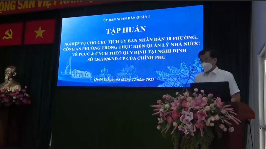 Tham dự buổi tập huấn có ông Vũ Nguyễn Quang Vinh, phó chủ tịch ủy ban nhân dân quận 1. Đại diện các ban ngành, các cán bộ phòng cháy chữa cháy và cứu nạn cứu hộ. Phát biểu tại buổi tập huấn, ông Vũ Nguyễn Quang Vinh phó chủ tịch ủy ban nhân dân quận 1. Ghi nhận sự nỗ lực của lực lượng Cảnh sát phòng cháy chữa cháy và cứu nạn của hộ. Đã kịp thời tham mưu Công an Quận, ủy ban quận. tổ chức triển khai Nghị định 136 về quy định chi tiết một số điều. Và biện pháp thi hành luật phòng cháy chữa cháy và luật sửa đổi bổ sung một số điều của luật phòng cháy chữa cháy. Thay thế cho Nghị định 79 ngày 31 tháng 7 năm 2014 của Chính phủ